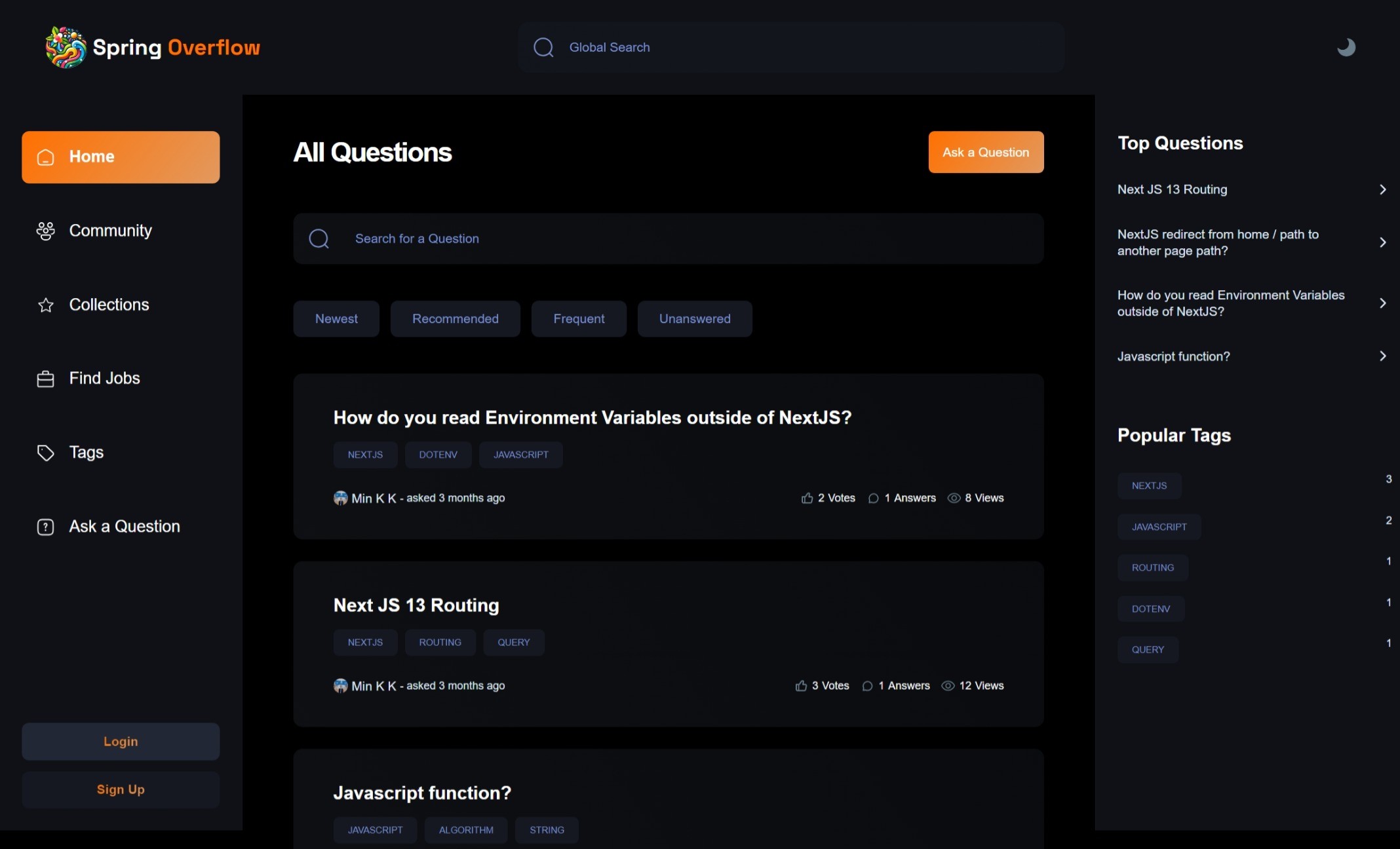 Spring Overflow is a community-centered platform progressive web app that combines web development and social justice, allowing users to ask and answer questions about software engineering, coding and programming problems, and search for software engineering jobs.